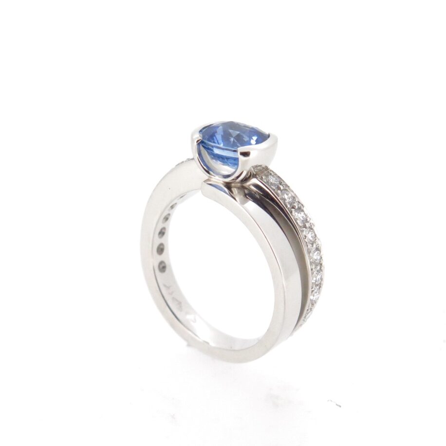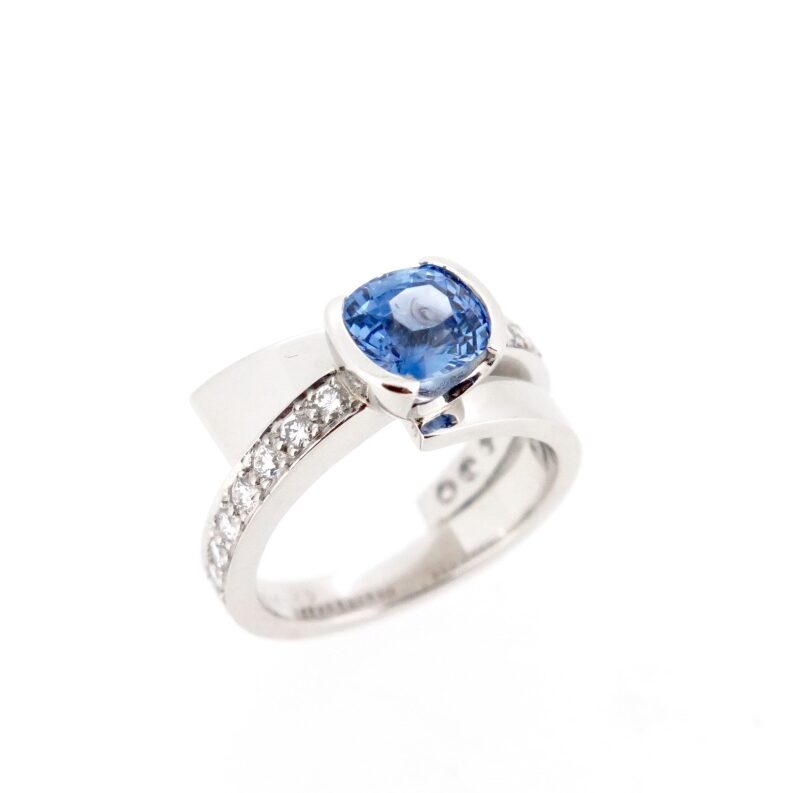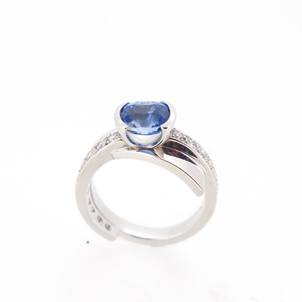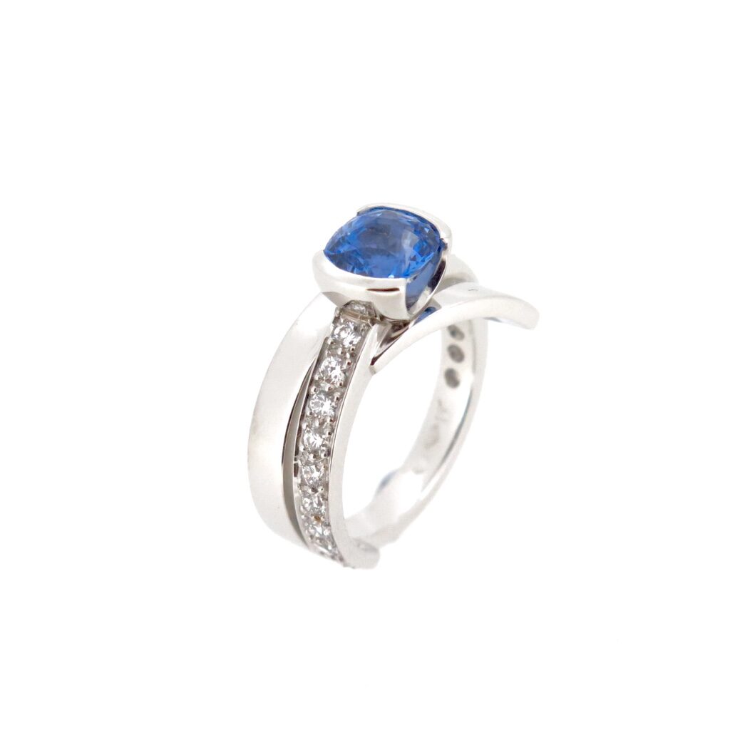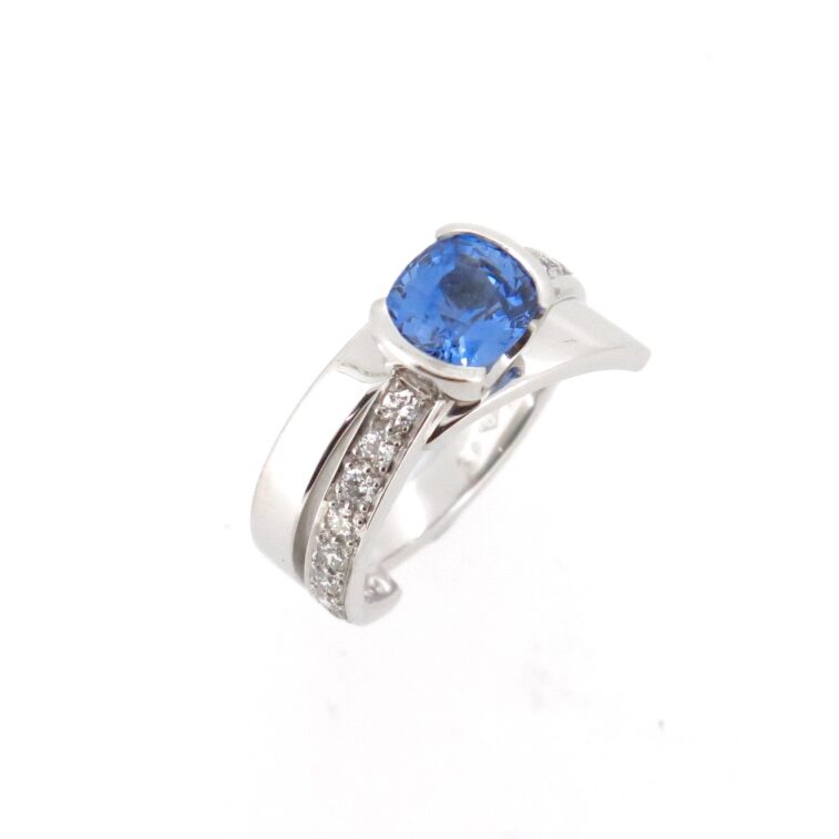 This design is about using Spirals around the finger, changing dimensions as the band travels around the finger. I have made a “U” shape half bezel setting to lift the Cushion cut Sri Lankan and show the body of the gemstone. Being an asymmetrical design the ring looks quite different from all angles. If you would like to look at some other beautiful Sapphires or discuss the “Spiral” designs please contact me for a free design consultation.