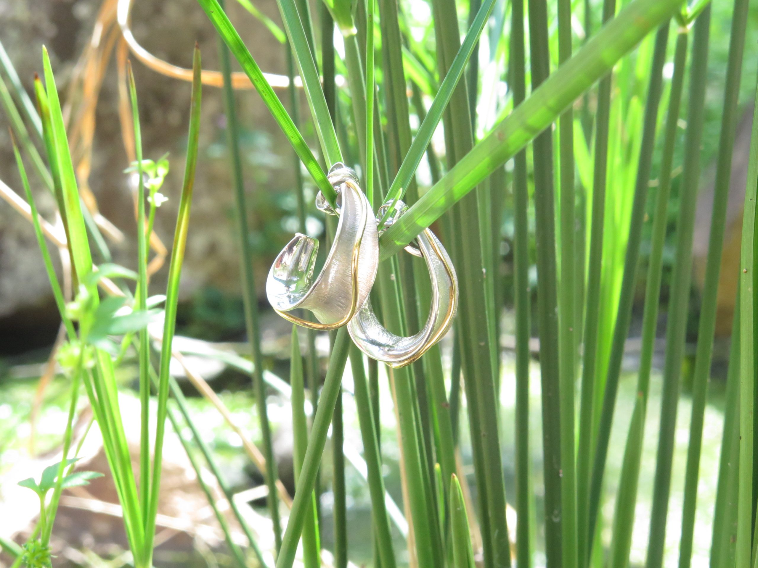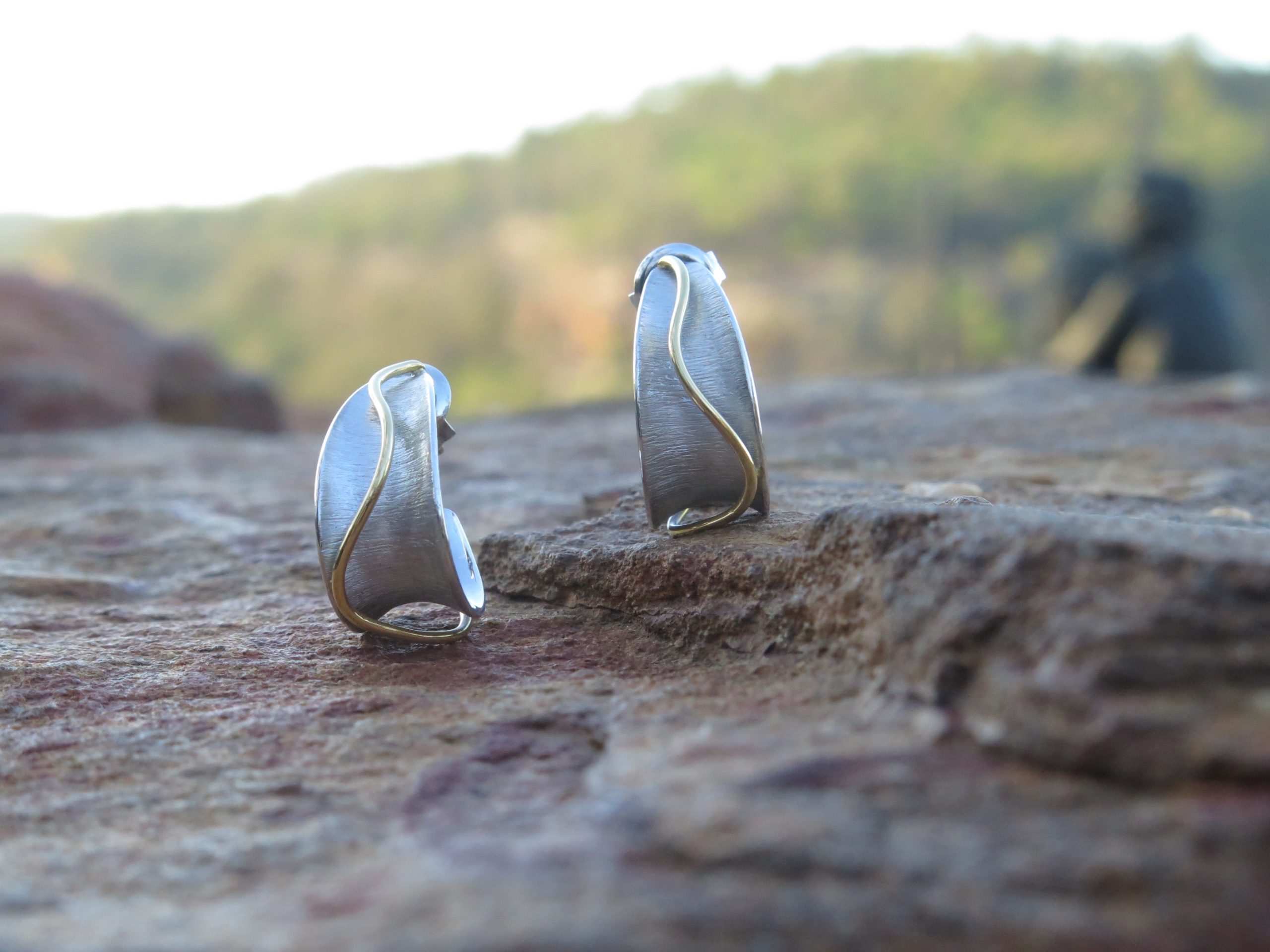 Handmade in Australia from solid 18ct white and yellow gold. A pair of super elegant, gold hoop earrings. The white gold convex design is finished with a textured surface, visually woven through with a highly polished yellow gold wave.