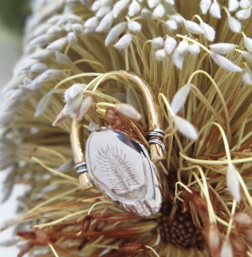 Handmade in Australia from 18ct yellow and white gold. This hand engraved fossil ring is for those who would love to add a bit of artisan quirkiness to their life.