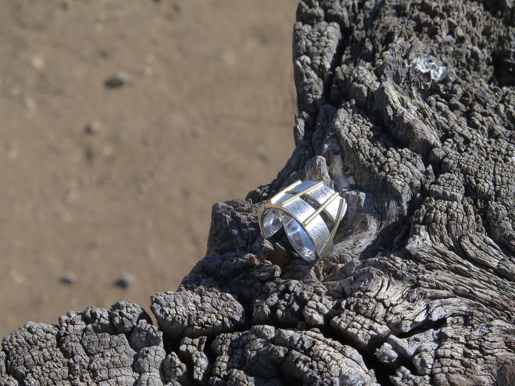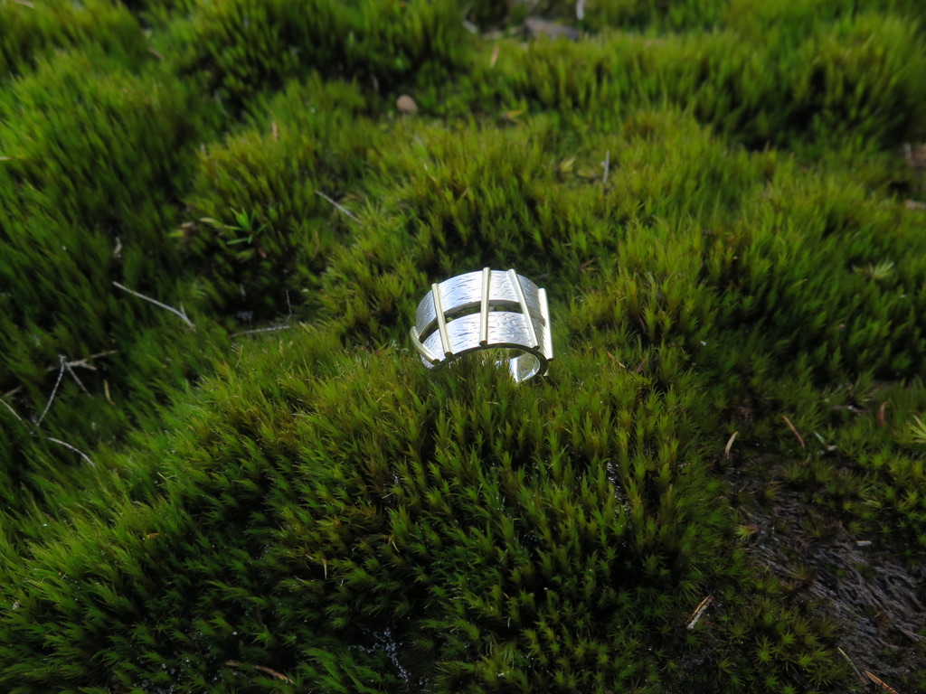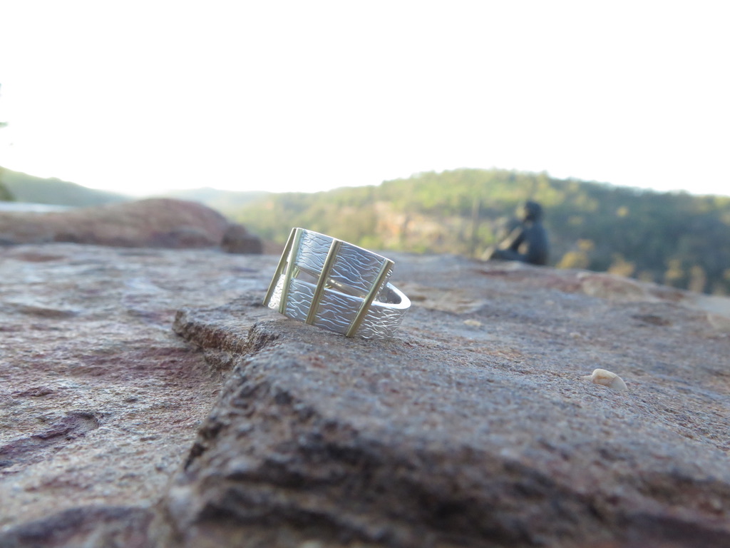 Handmade in Australia from solid palladium silver and 18ct yellow gold. The sculptured ring design is inspired by the outback farmlands and fencing. Ageing rustic fenceposts now silverly grey, with wire that catches the golden sunsets. A representation of the endless effort of those who work the land.