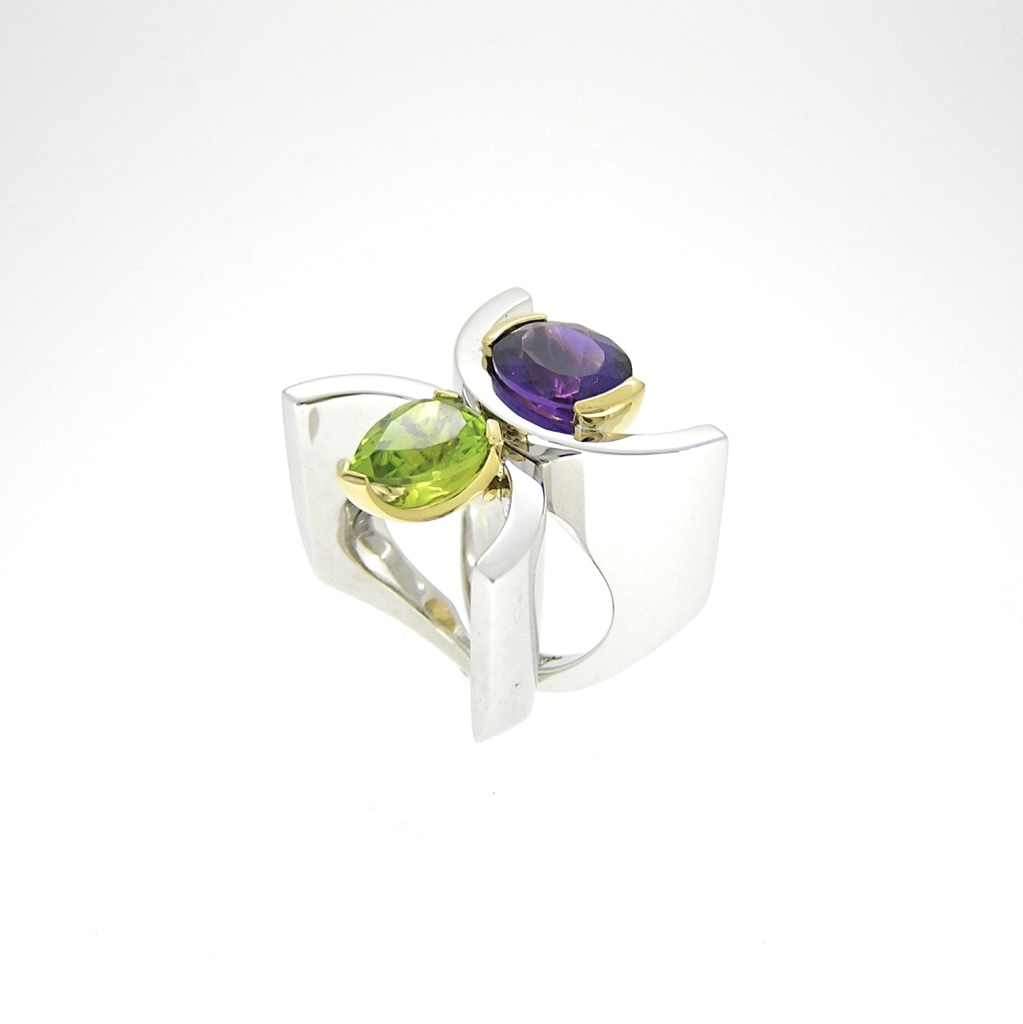 Handmade in Australia from sterling silver with 18ct yellow gold settings. These two Back to Back rings sit comfortably next to each other, formed in the classic constructionist style that Lucas enjoys. A deep purple Amethyst approximately 3 carats and a bright green Peridot approximately 2 carats, combined with a solid wall of sterling silver to create bold statement jewellery.