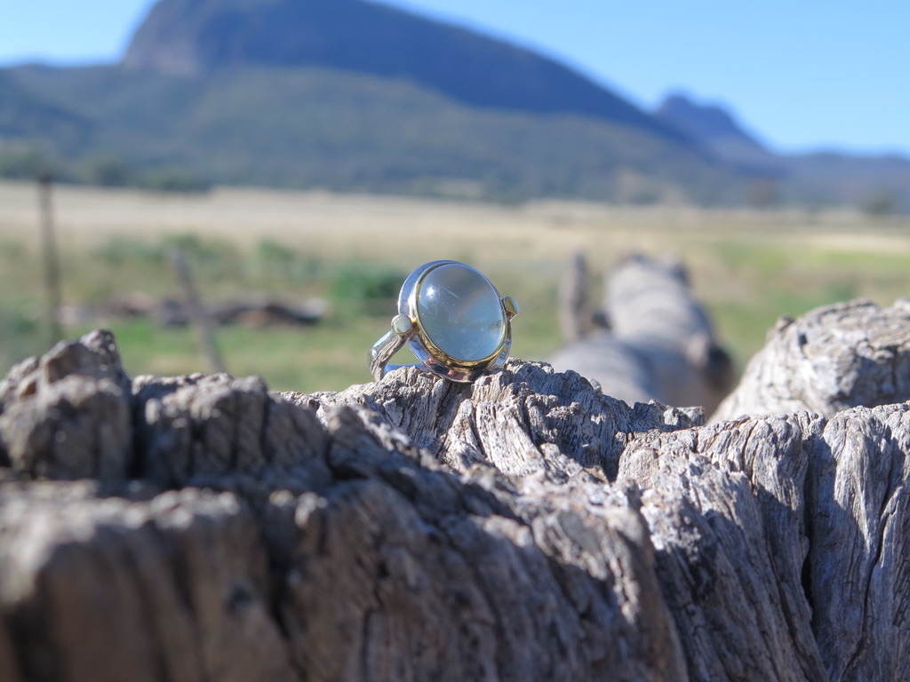 Handmade in Australia from solid silver palladium with 22ct gold highlights. This fabulous demi – fine dress ring is set with a grey green oval Cabochon Quartz of 10.89cts. There is also a pendant to match, making a stunning pair.