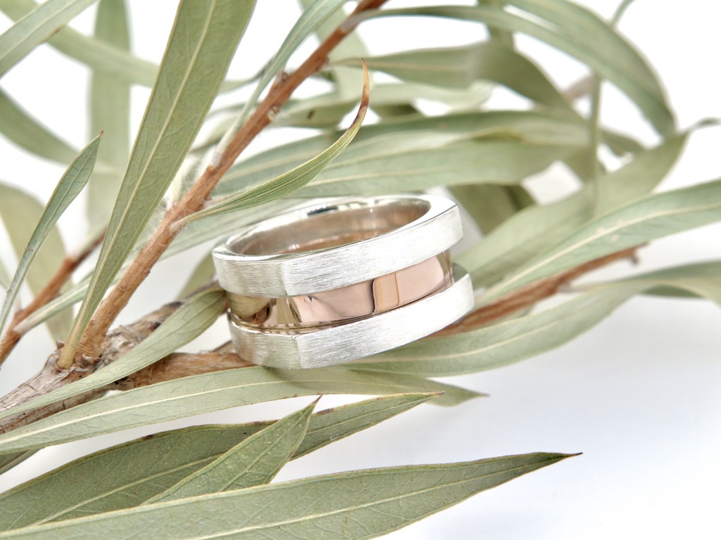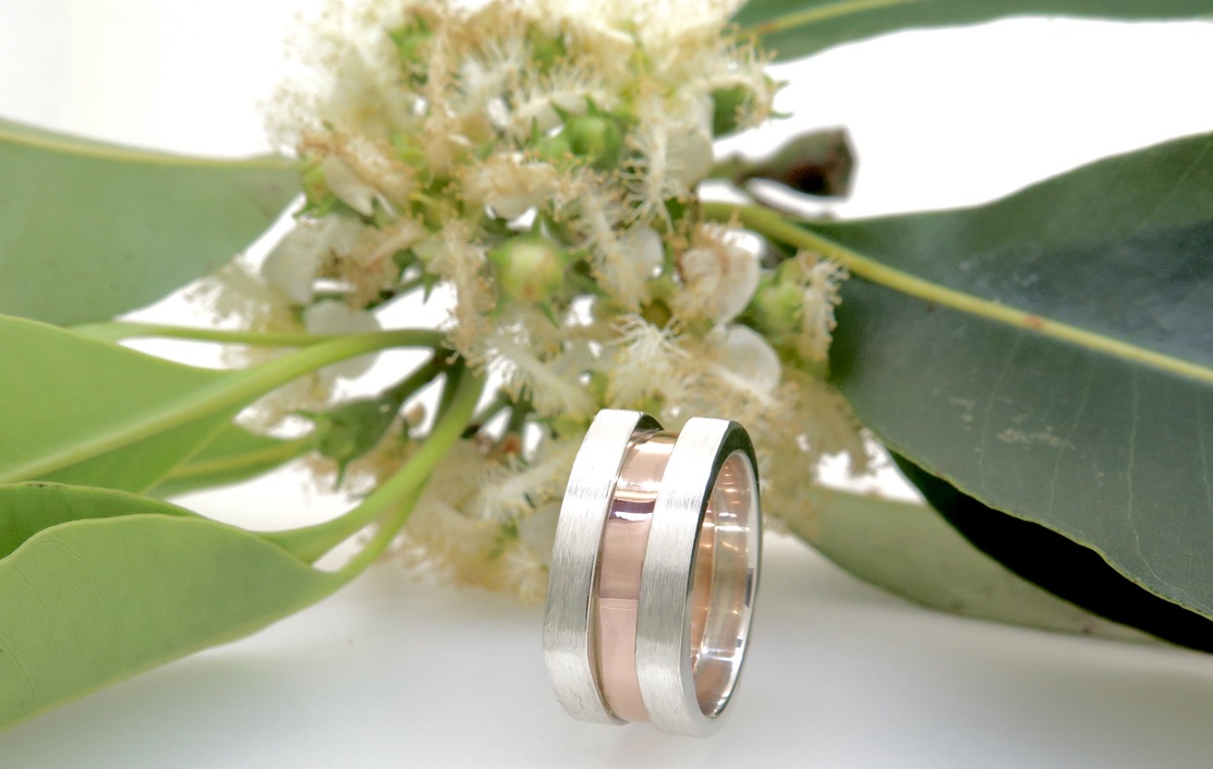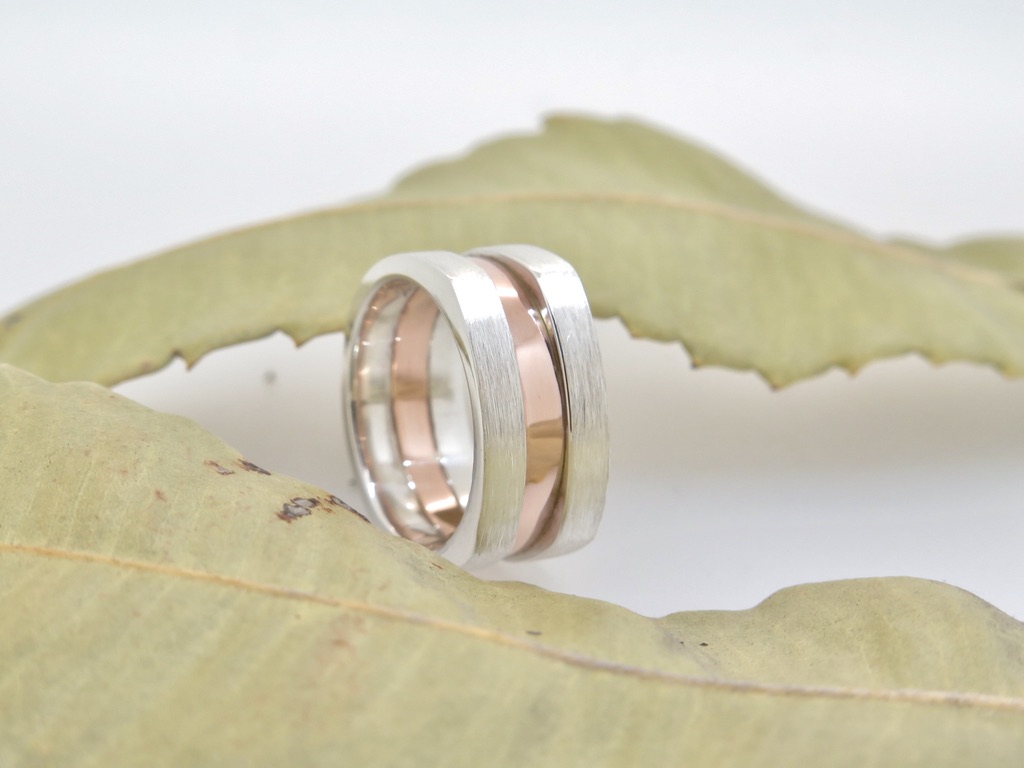 Handmade in Australia from solid sterling silver and 9ct rose gold. This two tone wide band dress ring is comprised of two outer sections of sterling silver that have a squared top and satin finish. The central 9ct rose gold band is lowered and polished to create a striking contrast not only between colours but also textures in the ring. The total width of the ring is 9 mm